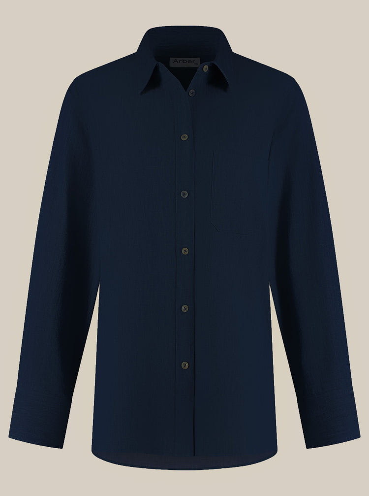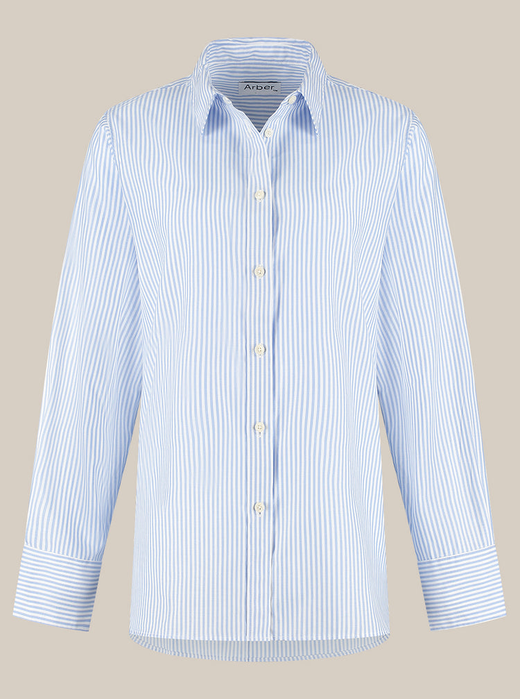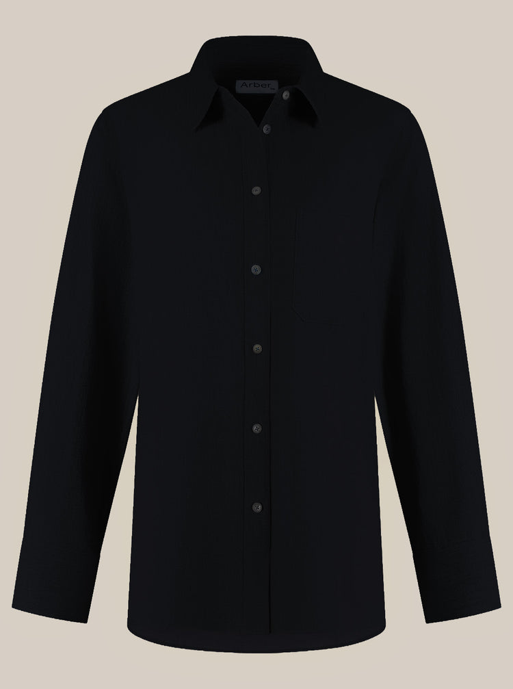 This oversized fit blouse has a shirt collar, buttons at front and a chest pocket. Long sleeves with round bigger cuffs and a slightly longer back makes this blouse stylish and casual at the same time.